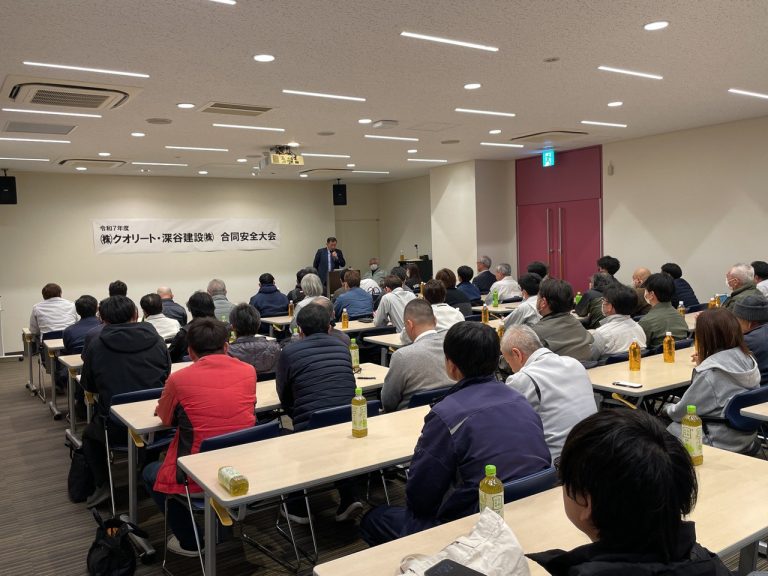 令和7年度 合同安全大会 2026.3.4 お知らせ 先日は「令和7年度 ㈱クオリート・深谷建設㈱合同安全大会」にご出席いただきました皆様に厚く御礼申し上げます。 安全意識の重要性について再確認し、無事故・無災害の職場づくりに向けた決意を新たに、次年度も一人ひとりが安全意識を高めることで、皆様の健康と安全を守り、会社の発展に貢献してまいります。 - INFOMATION TOP -